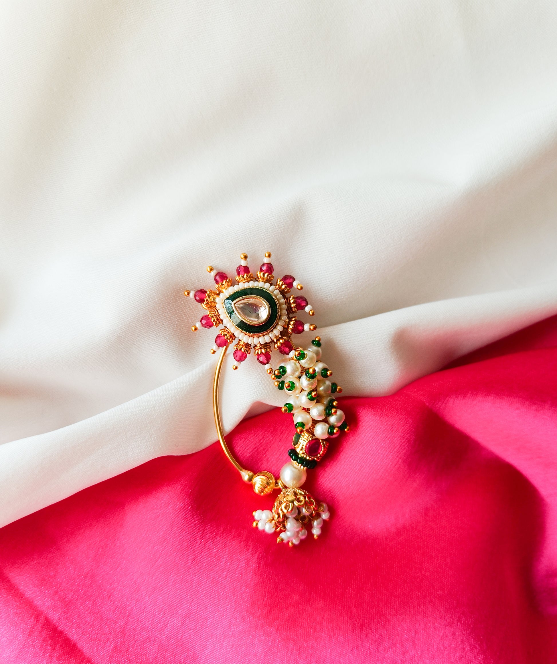 Add a touch of royal elegance with this handcrafted Maharashtrian Peshwai Nath featuring Kundan stonework, meenakari detailing, and pearl drops.
