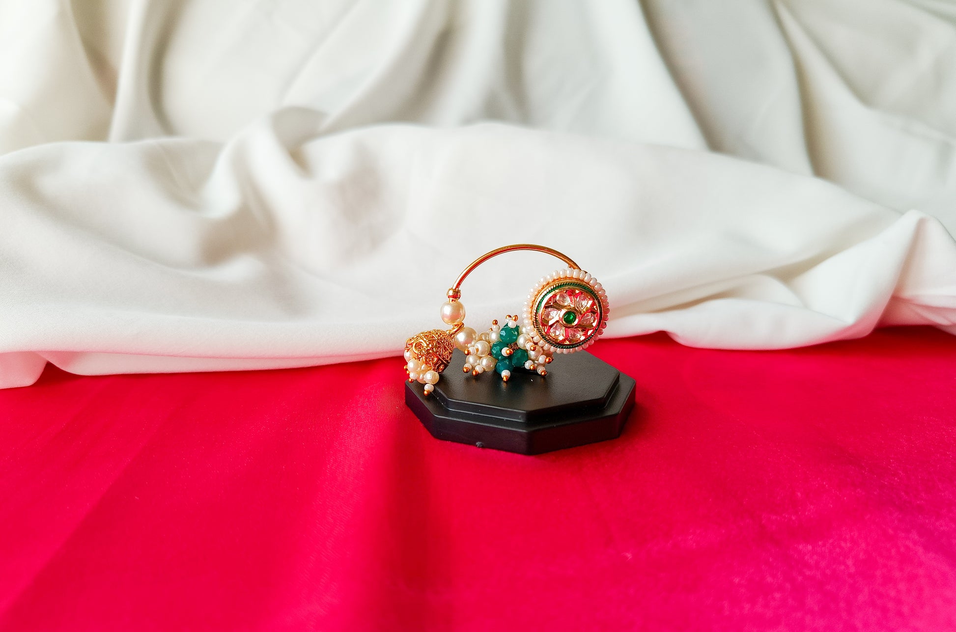 Elegant handcrafted Maharashtrian Nath featuring Kundan work, pearls and green stone detailing.